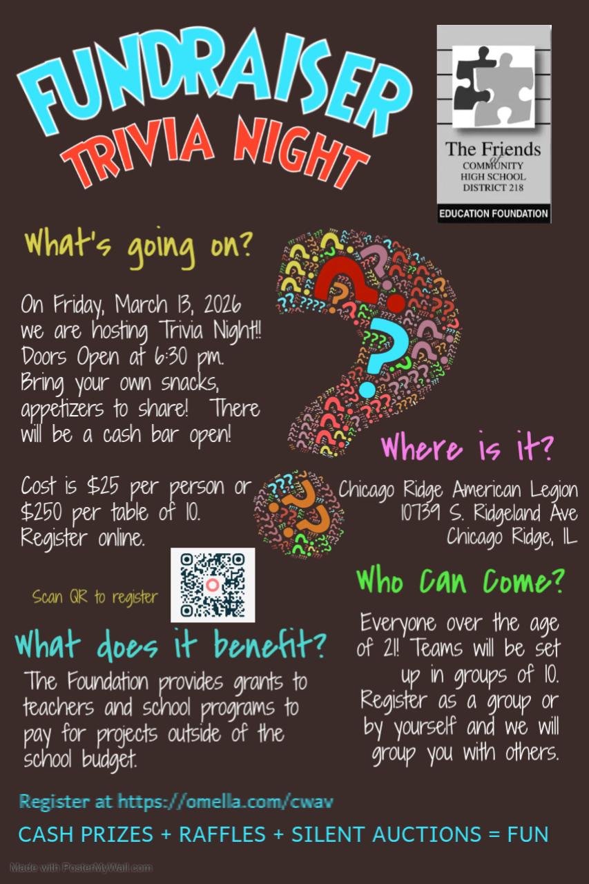 The Trivia Night fundraiser will help us raise funds for our student scholarships and teacher mini-grants. The evening will consist of cash prizes, raffles, silent auctions, and some friendly competition! You must be 21 or older to attend, and please plan on bringing your own snacks and appetizers. This year's event is Friday, March 13, 2026 at 6:30pm at the Chicago Ridge American Legion. Registration is now open!